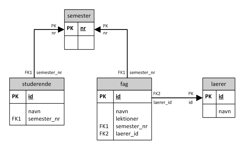 | Attributterne er i hovedsagen selvforklarende. De forskellige primær-nøgler er, pånær nr i semester-tabellen (der ikke skal implementeres), blot fortløbende numre, der skal genereres af databasen. lektioner i fag-tabellen er antallet af lektioner pr. uge for det pågældende fag. | |