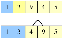 Som det ses skal det nye element indsættes efter den sorterede del af arrayet. Det skyldes, at der for alle elementer key i den gullige del må gælder, at key>=tabel[i-1], ellers ville et sådant element allerede være udtaget som det daværende mindste, hvilket ikke er sket. Algoritmisk skal man altså finde elementet, og dernæst foretage et swap mellem det og det element der følger efter det sorterede delarray. | |||||||||
