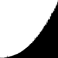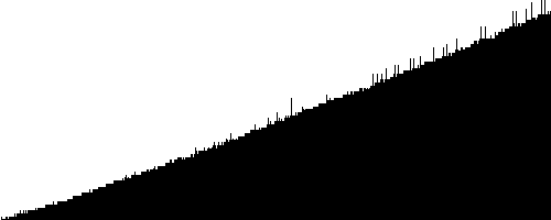 | Man observerer en række stejle "linier" ved siden af hinanden. Det skyldes at hver linie repræsenterer et del-array hvori elementerne er sorterede. Efterhånden flettes disse del-arrays og linierne bliver mindre spejle og mere sammenhængende. Man observerer ligeledes, at arrayet overordnet set sorteres fra venstre mod højre. Det skyldes at vi hele tiden foretager et rekusivt kald for at sortere det venstre del-array før det højre (inorder gennemløb af rekursionstræet; hvis man kender disse betegnelser). | |||||||||