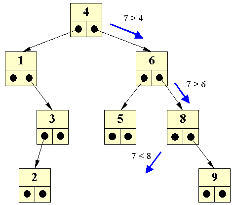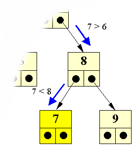 Dette gøres ved at søge efter 7, og indsætte den nye knude det sted; hvor man ville forvente at finde 7. Vi ser her, at 7 skal placeret som det venstre barn af 8: Indsættelse af ny knude med 7