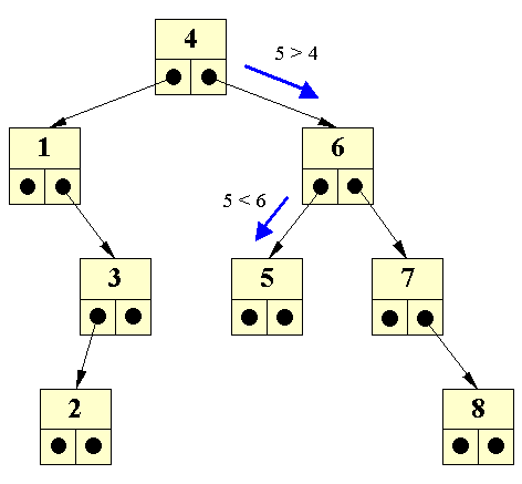 < > Bemærk ulighedstegnene i de to uligheder, der er placeret ved de blå pile. Når man i ulighederne placerer det søgte forrest (i dette tilfælde 5), vil ulighedstegnet ligne en pil, der viser i hvilken retning vi skal gå! Ind vi se på implementationen af søgning, vil vi først se på indsættelse, da vi skal have noget at søge i.