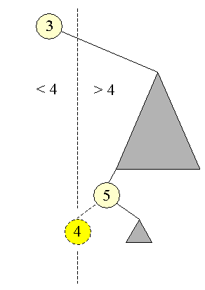 Hvordan skal man indsætte et nyt element i et søgetræ? Da der er tale om et søgetræ skal ordningen være bevaret efter et kald af insert-metoden. Hvis man, som det tidligere er nævnt, ser på søgetræet fra venstre mod højre, er det ordnet i ikke-aftagende orden. Man kan derfor slå en streg ned gennem træet, det sted hvor det nye element skal placeres i ordningen. Nederst, på en af sidderne af denne streg, må der være en knude der mangler et blad ind mod stregen. Hvorfor det? Hvis man betragter den sidste kant der krydser den lodrette streg, vil barnet igennem denne kant ikke have nogen efterkommere der krydser tilbage. Hvis man i dette undertræ finder den største/mindste, alt efter hvilken side vi er på, vil denne knude ikke have noget barn i den side der vender ind mod den lodrette streg. Her kan den nye knude placeres. Ræsonnementet er illustreret i følgende figur: Indsættelse af 4, som blad på knude, der mangler barn ind mod stregen