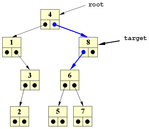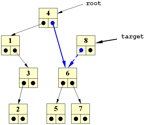 Her vil vi gerne fjerne elementet: 8. Dette gøres ved at føre referencen til target udenom, og ned til target's undertræ: Oprykning af venstre undertræ