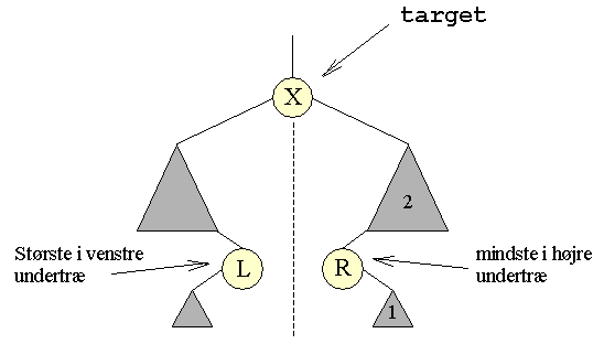 De to værdier der er nærmest Om L og R gælder der, at de er henholdsvis det største og det mindste element i deres respektive undertræer af target. At sådanne knuder findes, følger af vores tidligere observation, af at elementerne står i ikke-aftagende orden, læst fra venstre mod højre. Disse to knuder vil indeholde de to elementer, der kommer lige før, henholdsvis lige efter, target's værdi: X. Ligeværdige Både L og R er derfor ligeværdige kandidater til at erstatte target's værdi: X. Af praktiske grunde beslutter vi os for altid at bruge en bestemt af dem: R, men vi kunne lige så godt have valgt L. Operationen går nu ud på at flytte værdien R op i target, og slette R's oprindelige knude: Efter R har erstattet X