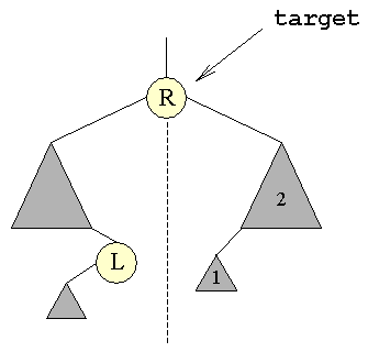 Dette er den interessante situation, idet de to foregående har været ukomplicerede. Her skal man se på det undertræ der har target som rod. Da target har to undertræer vil der i disse være to knuder L og R, der er placeret på følgende måde: De to kandidater: L og R, der kan erstatte X