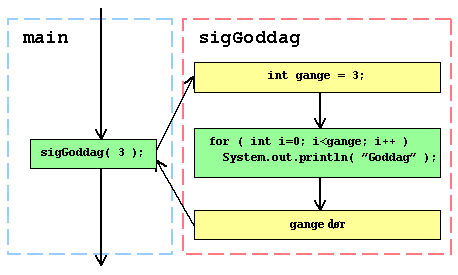 class MetodeEksempel_3 { static void sigGoddag( int gange ) { for ( int i=0; i<gange; i++ ) System.out.println( "Goddag" ); } public static void main( String[] argv ) { sigGoddag( 3 ); } }Her anvendes der en såkaldt parameter til at overføre en værdi til metoden. Erklæringen af gange optræder nu oppe mellem paranteserne i metode-hovedet, men anvendes stadig i selve metode-kroppen. Værdien 3 er her placeret i selve kaldet, hvor den optræder mellem paranteserne. Formelle og aktuelle parametre Alt hvad der optræder mellem paranteserne i kaldet og paranteserne i metode-hovedet kaldes parametre, men for at kunne skelne mellem parametre, der står disse to steder, kalder man de parametre der findes i metode-hoveder: formelle parametre, og dem der optræder i kaldene: aktuelle parametre. Her er heltals-literalet 3 en aktuel parameter - den har en konkret værdi, mens gange er en formel parameter - dens værdi afhænger af den aktuelle parameter. Lad os tegne hvad der sker i eksemplet: Figur 5: