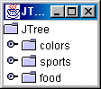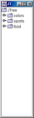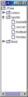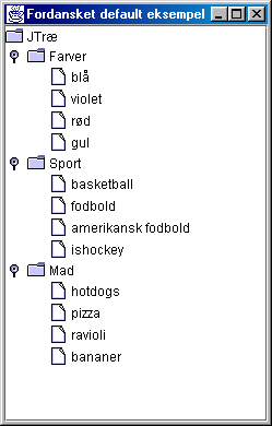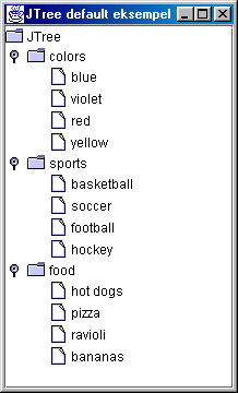 | Som sagt er det lidt pudsigt at JTree's default-konstruktor giver os dette eksempel med farver, sportsgrene og madretter, og man skal ikke lede efter andre Swing komponenter med samme særhed — det er kun forfatteren til JTree, der har gjort det. | |||||||||