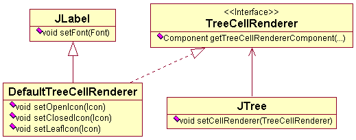 | Det mest almindelig er at man anvender en DefaultTreeCellRenderer. Specielt anvender man ofte de tre setIcon-metoder. Man bemærker her muligheden for at sætte forskellige iconer for åbne og lukkede knuder, som blev omtalt ovenfor i forbindelse med Java's default eksempel. | |||||||||