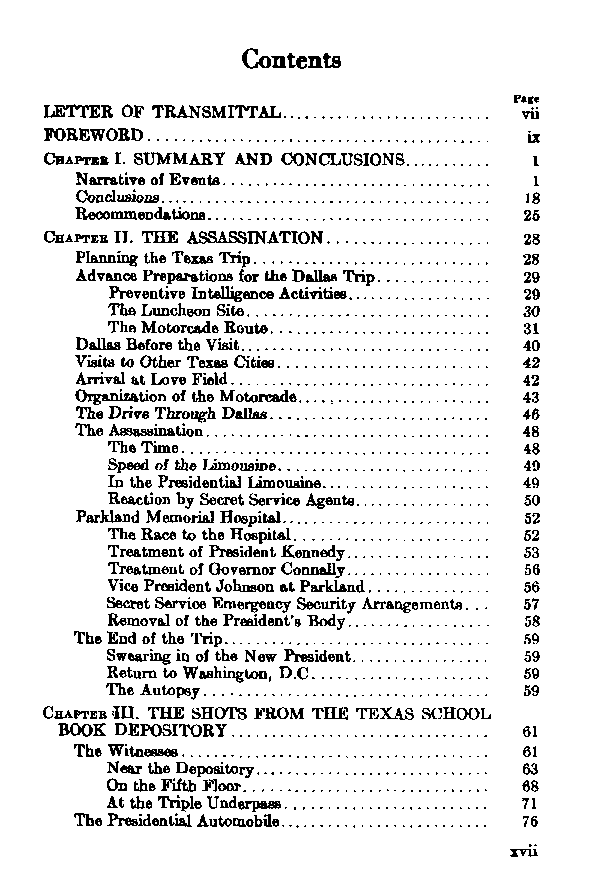 Første side af indholdsfor-tegnelsen i "The Warren Commission Report"