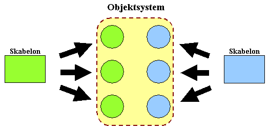 | Klasser og instanser | Skabeloner kalder man normalt klasser. Det at lave et objekt ud fra en klasse kalder man at instantiere. Af samme grund kalder man ofte objekter, der er lavet ved instantiering for instanser. Man siger ligeledes at et objekt er en instans af en klasse, hvis det er lavet ved at instantiere ud fra klassen. | |