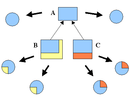 | Som man ser i figuren, tilføjer vi nye egenskaber i de to sub-klasser. I sub-klassen B er disse illustreret med gult, og i subklasse C med rødt. Disse egenskaber kan være såvel operationer som data. I instanserne ser man, at det blå stadig er der, men at der nu også er de nye egenskaber der supplerer de nedarvede. | ||