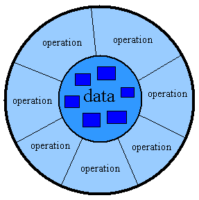| Operationerne ligger beskyttende uden om datakernen. De beskytter og styrer den indirekte adgang til data. Som nævnt har ingen udenfor direkte adgang objektets data, men operationerne deles om datakernen og ved at anvende dem kan man udefra indirekte påvirke datakernen. | ||