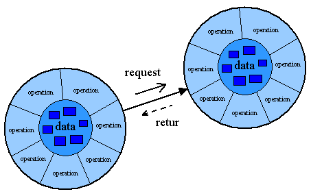| Indirekte læse eller ændre | Det "et eller andet" objektet gør, kan f.eks. bevirke at der sker ændringer i dets datakerne. På den måde har det objekt som sendte requesten indirekte fået adgang til at ændre datakernen. Det der returneres kan være et resultat, der baserer sig på hvilke data der var i kernen, og på den måde får det objekt der sendte requesten, indirekte adgang til at læse i datakernen. Det er væsentligt at bemærke, at det er objektet selv der har kontrol med: hvad der skal ændres, og hvad det vil returnere af oplysninger. | |