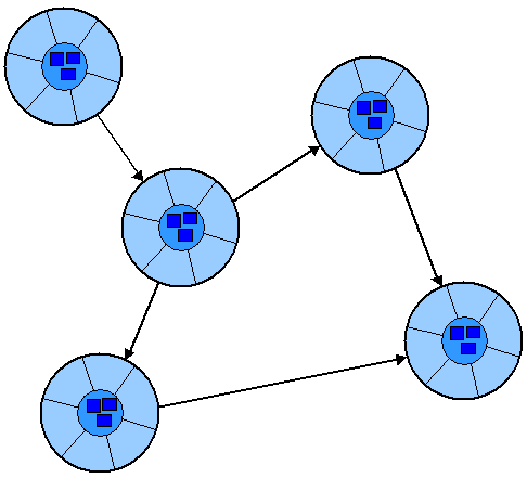| Associering | Måden objekter samarbejder på, kræver at de kender hinanden. Dette kendskab kaldes associering. Man er associeret et objekt, hvis man er kendt af det pågældende objekt. Objekter realiserer associering ved at have referencer til hinanden; hvor igennem de kan kommunikere. Vi vil illustrere dette med pile, der viser hvem der kender hvem. | |